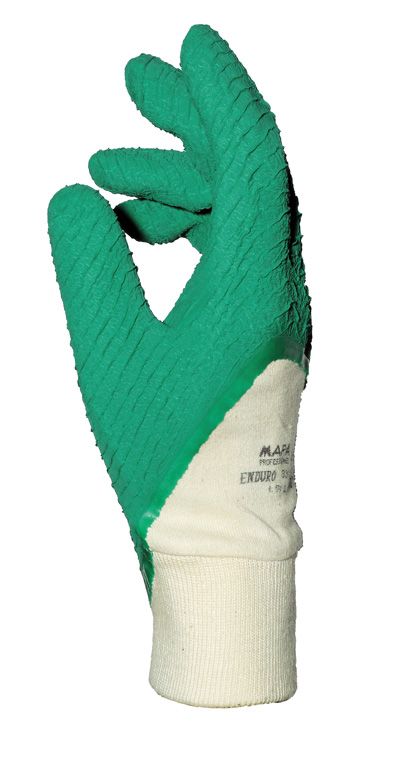 Schutzhandschuh aus Baumwollstrick mit grüner Naturlatexbeschichtung mit verstärkter Aufrauung an Handfläche und Fingern. Dank anatomischer Form und elastischem Strickbündchen passt sich Schutzhandschuh ideal an die Hand an. Das starke Profil bietet hohe Griffsicherheit und ermöglicht sicheres Greifen selbst feuchter Gegenstände.
