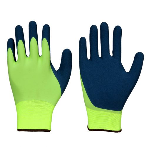 Doppelt beschichteter Handschuh. 15-Gauge neongelber Nylon-Feinstrick-Handschuh. Die untere grüne Vollbeschichtung besteht aus einem weichen und atmungsaktiven Latex-Schaum. Die äußere griffige Teilbeschichtung ist aus einem blauen gesandeten Latex. Beweglich, griffig und flüssigkeitsabweisend.