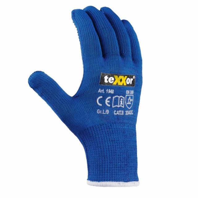 Polyester/Baumwoll/Glasfaser-Feinstrickgewebe (blau), mit einseitig aufgebrachten roten PVC-Noppen auf den Handinnenflächen, Strickbund